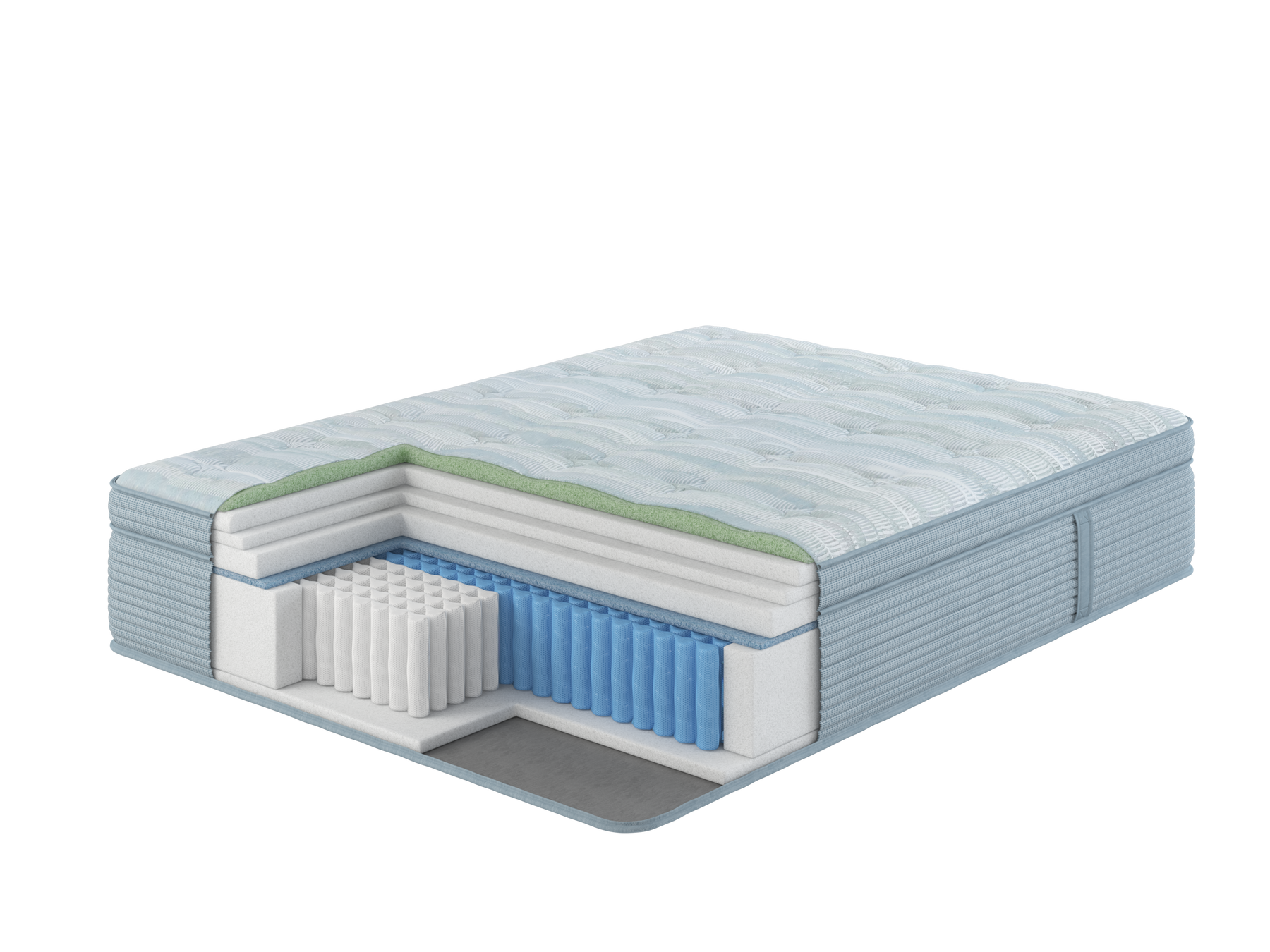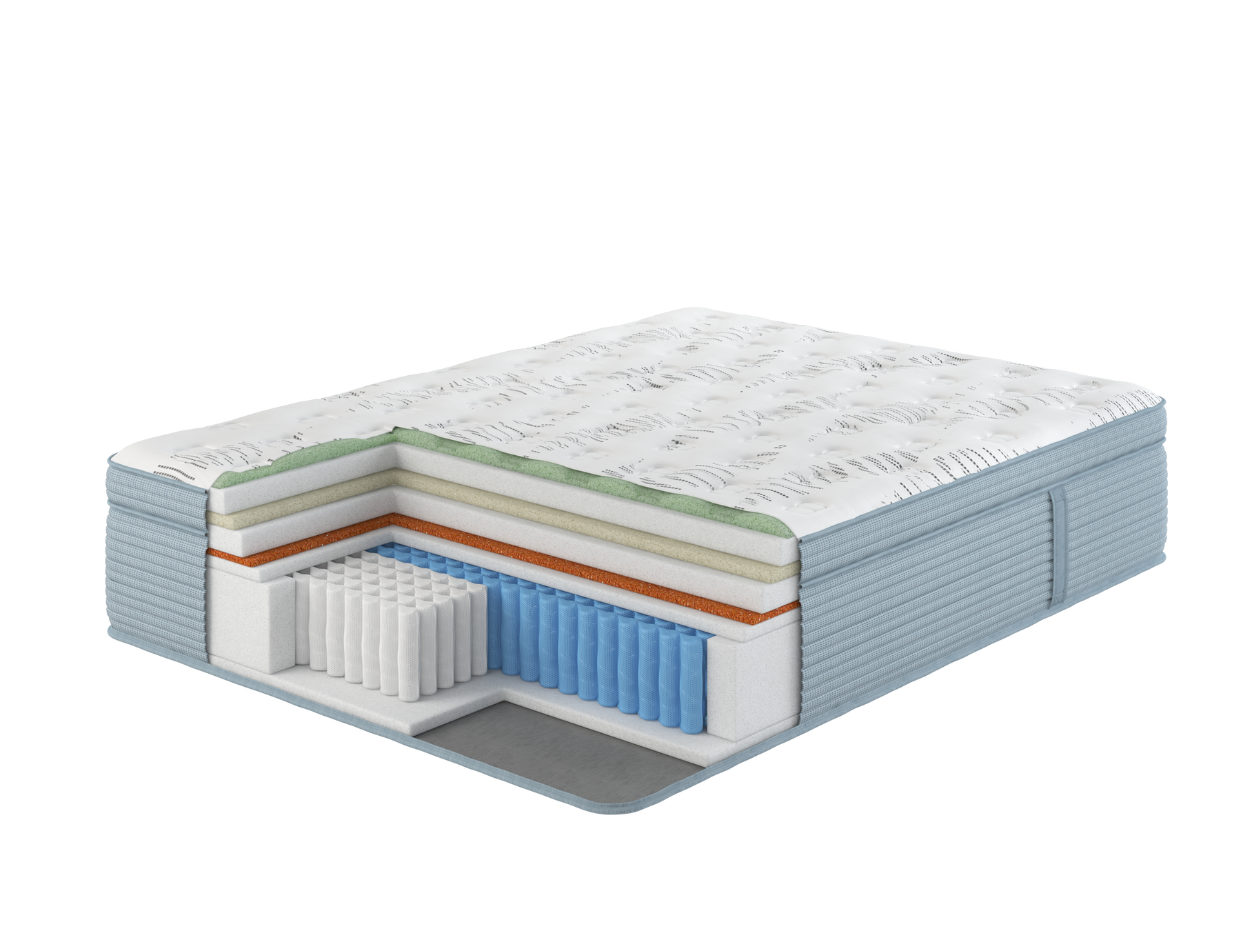 The comfort layers include breathable fiber padding, soft foam cushioning, and gel-infused foam designed to conform to the body’s shape during rest. These layers help distribute body weight across the surface while allowing airflow through the mattress materials. The internal support system consists of connected steel coils arranged in a continuous coil structure, which helps maintain consistent support across the sleeping surface.