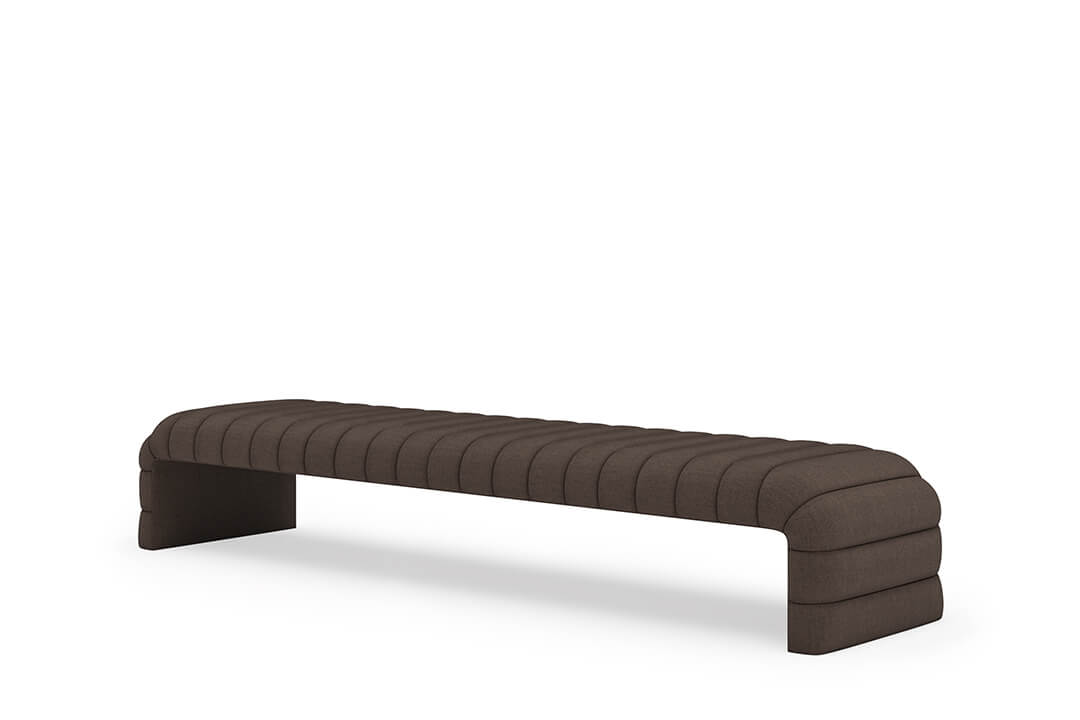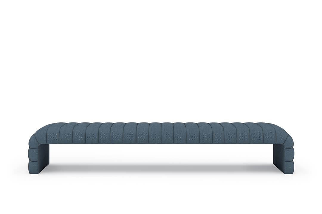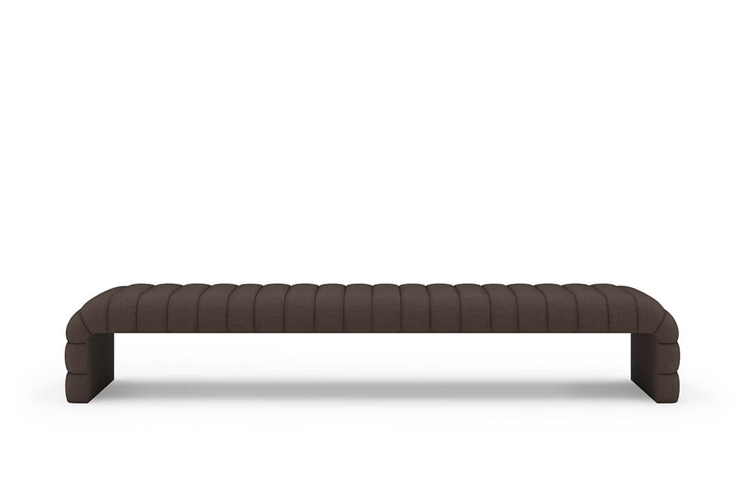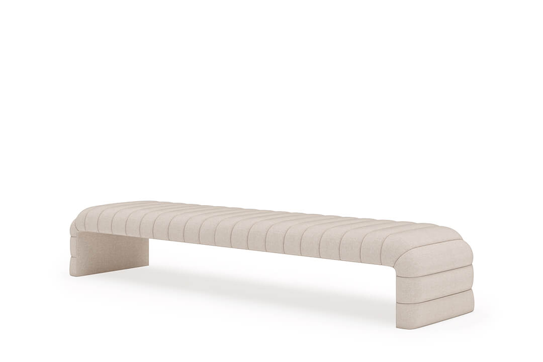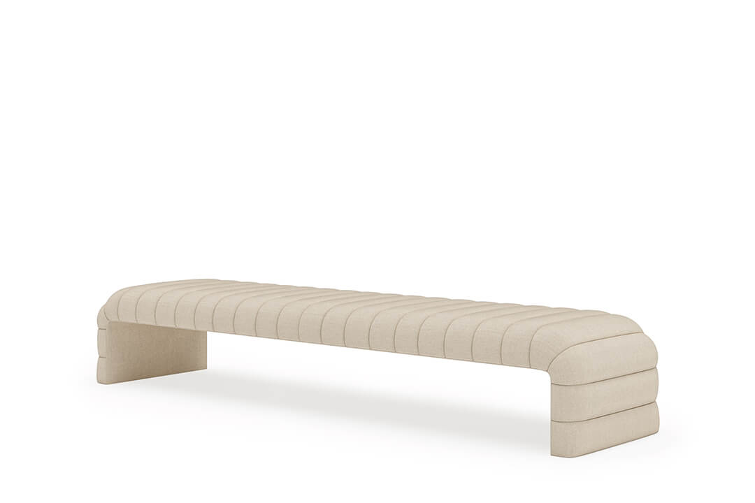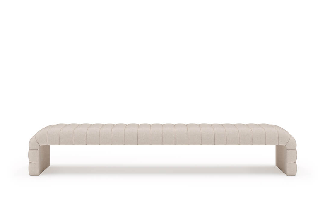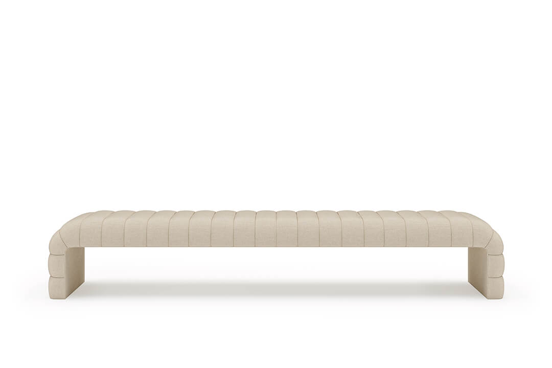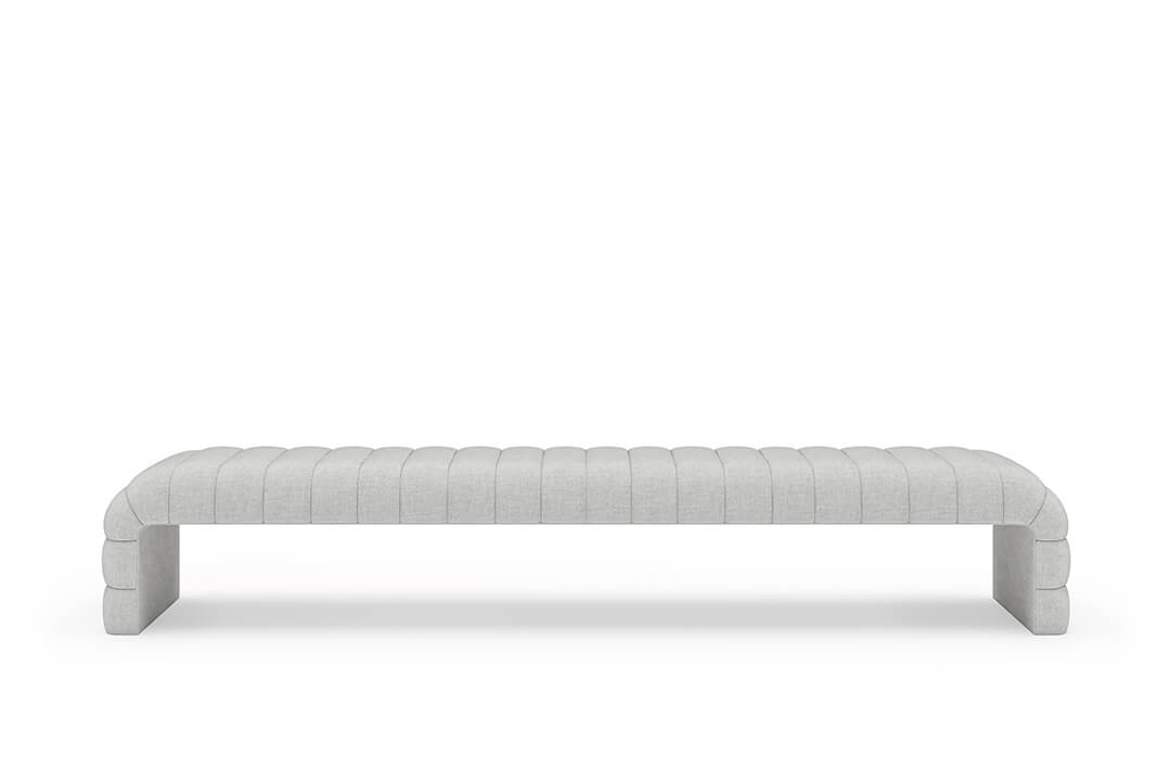 This upholstered bench is designed as a functional seating and accent piece for bedroom use. It features a rectangular silhouette with channel tufted detailing across the upholstered surface, creating a structured and uniform appearance. The bench is sized to provide ample seating space and to align visually with larger bed frames placed at the foot of the bed.