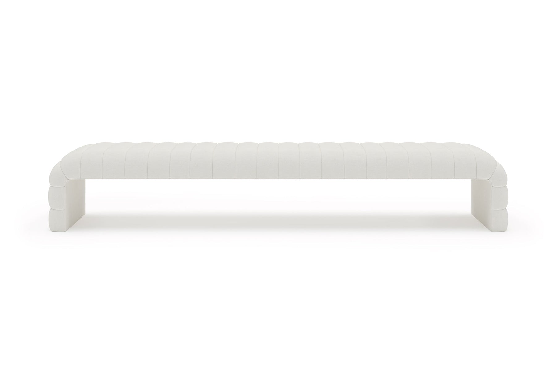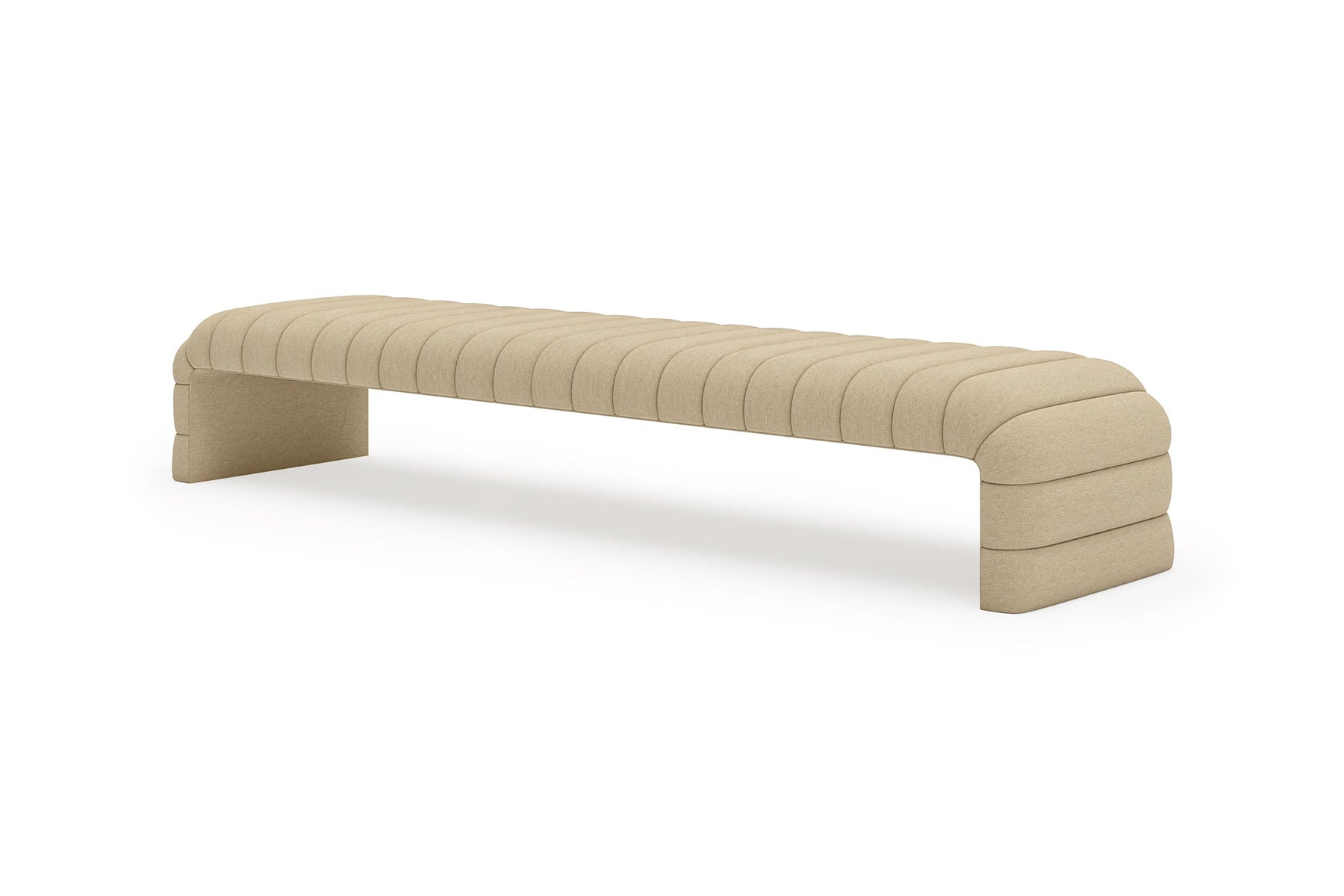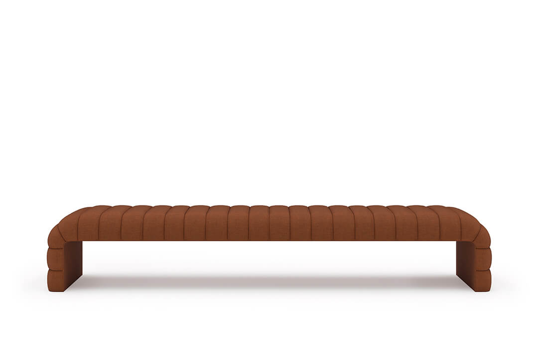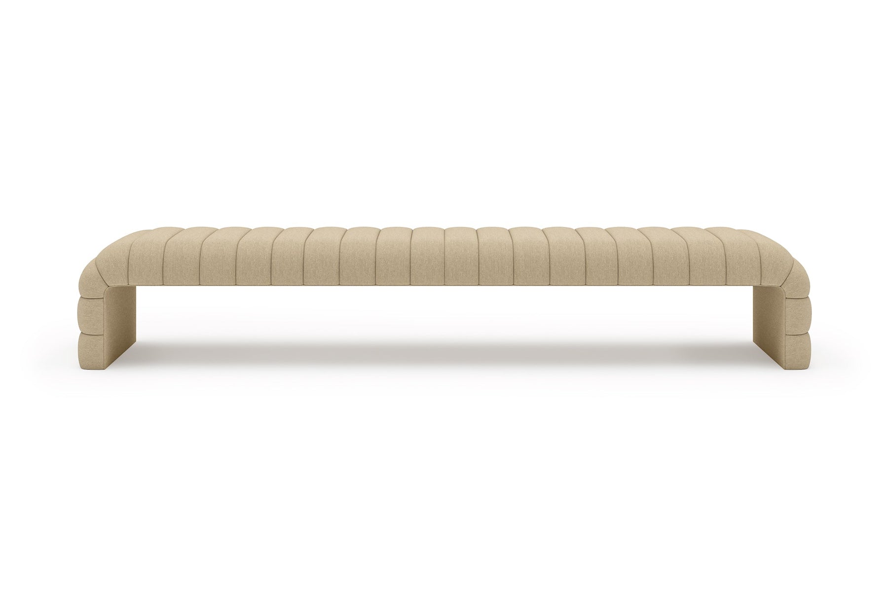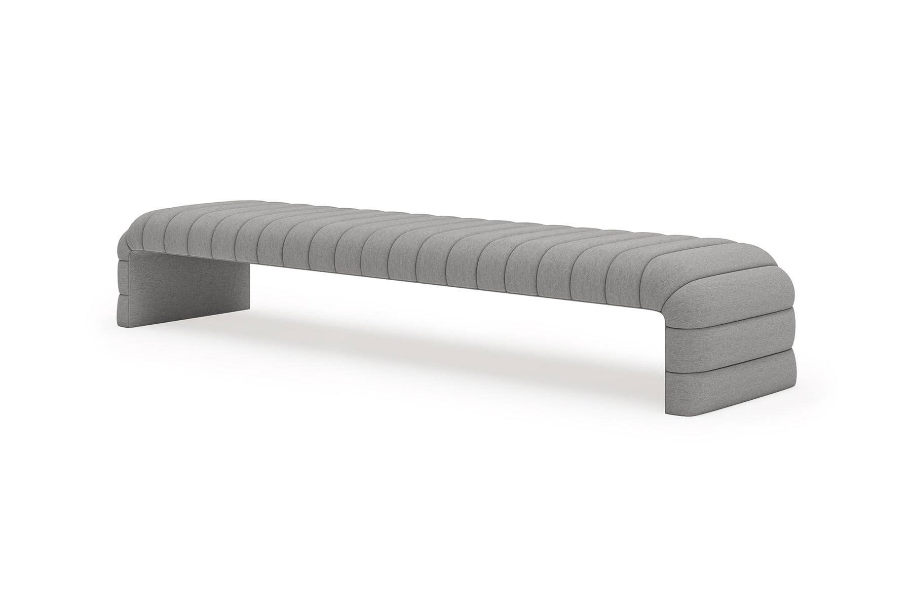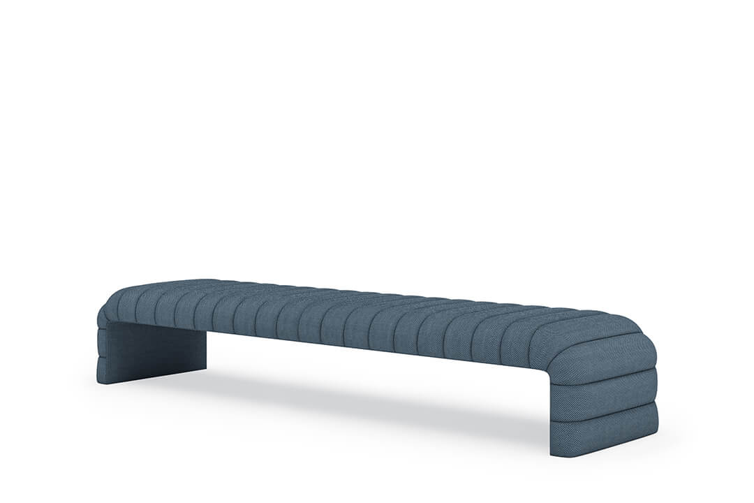 This upholstered bench is designed as a functional seating and accent piece for bedroom use. It features a rectangular silhouette with channel tufted detailing across the upholstered surface, creating a structured and uniform appearance. The bench is sized to provide ample seating space and to align visually with larger bed frames placed at the foot of the bed.