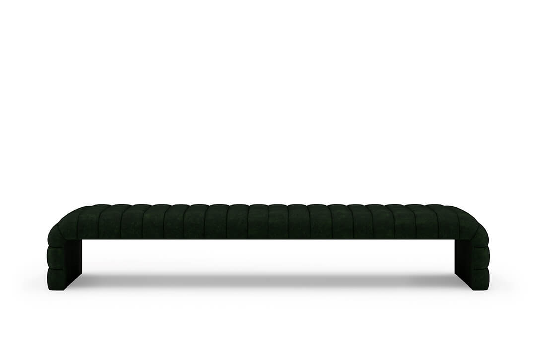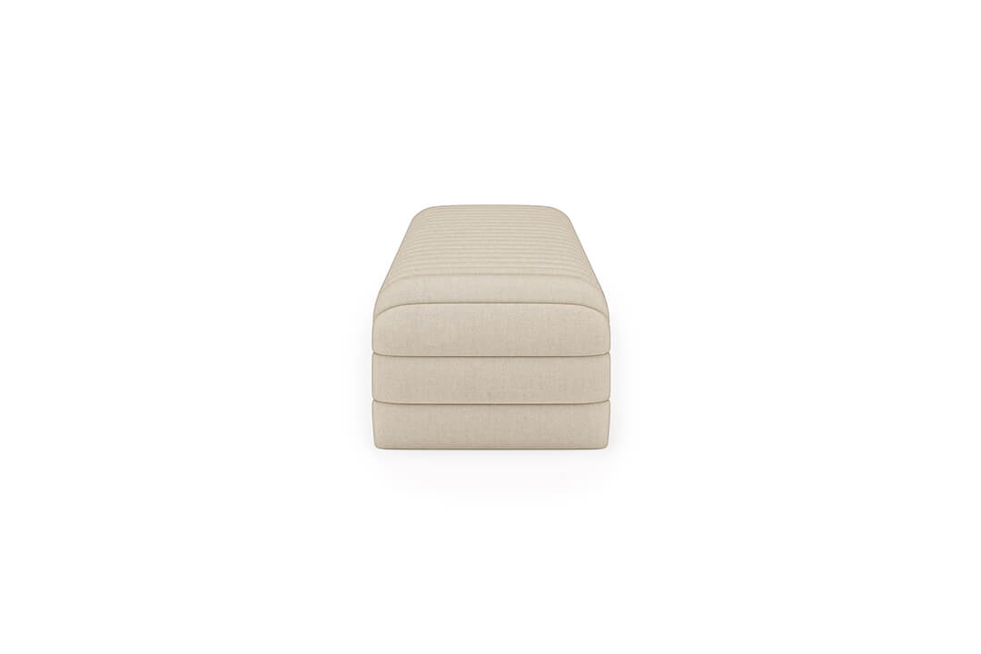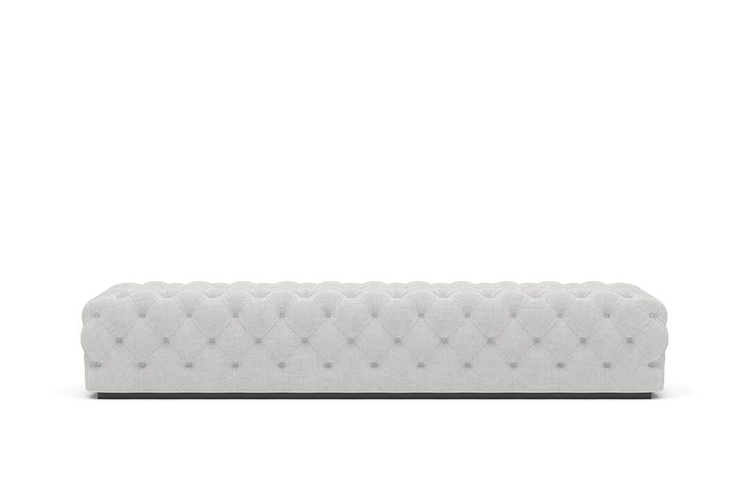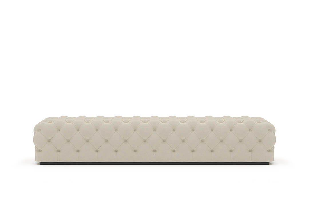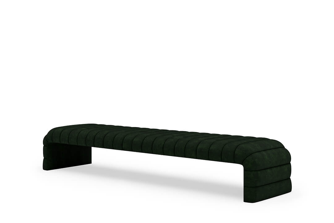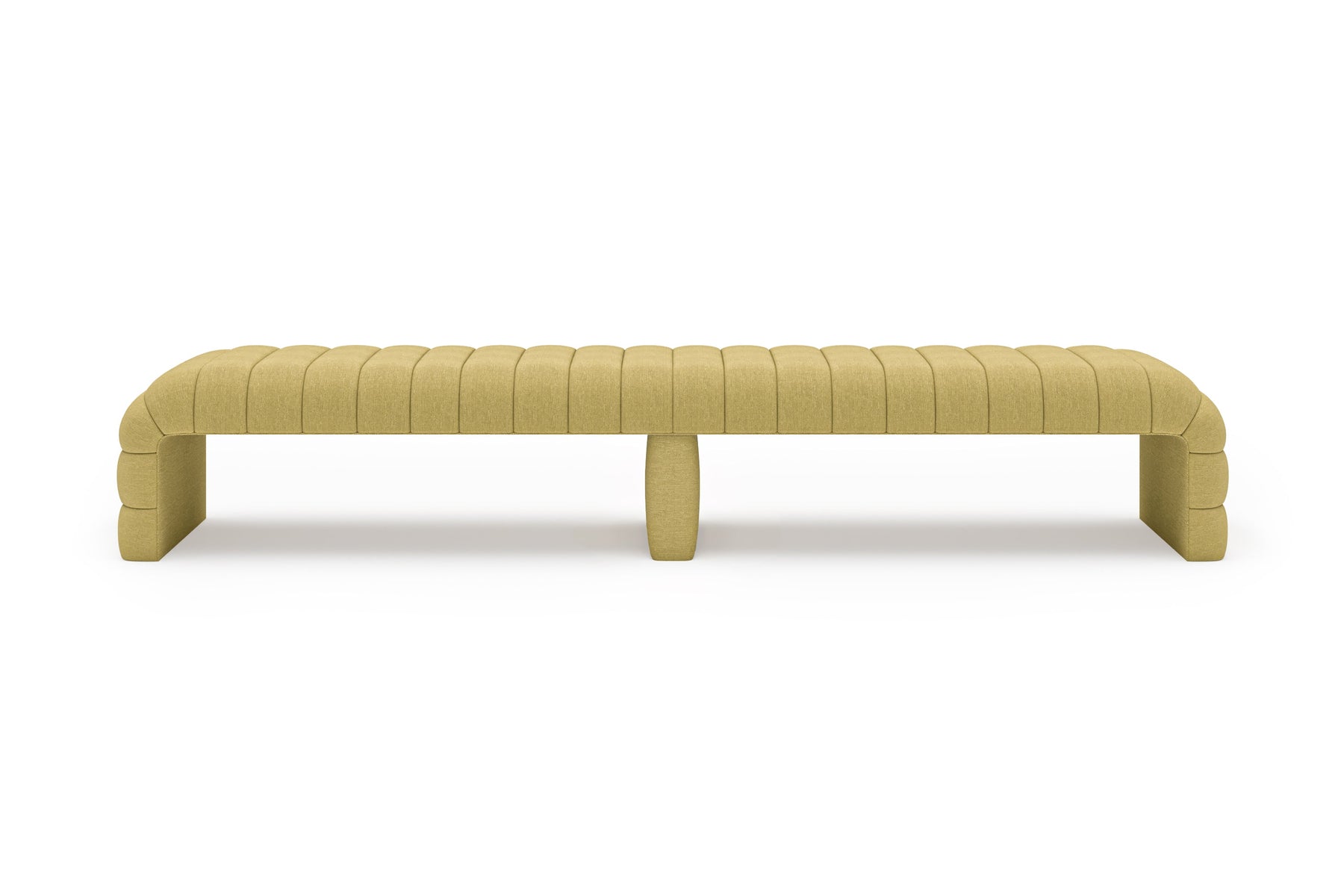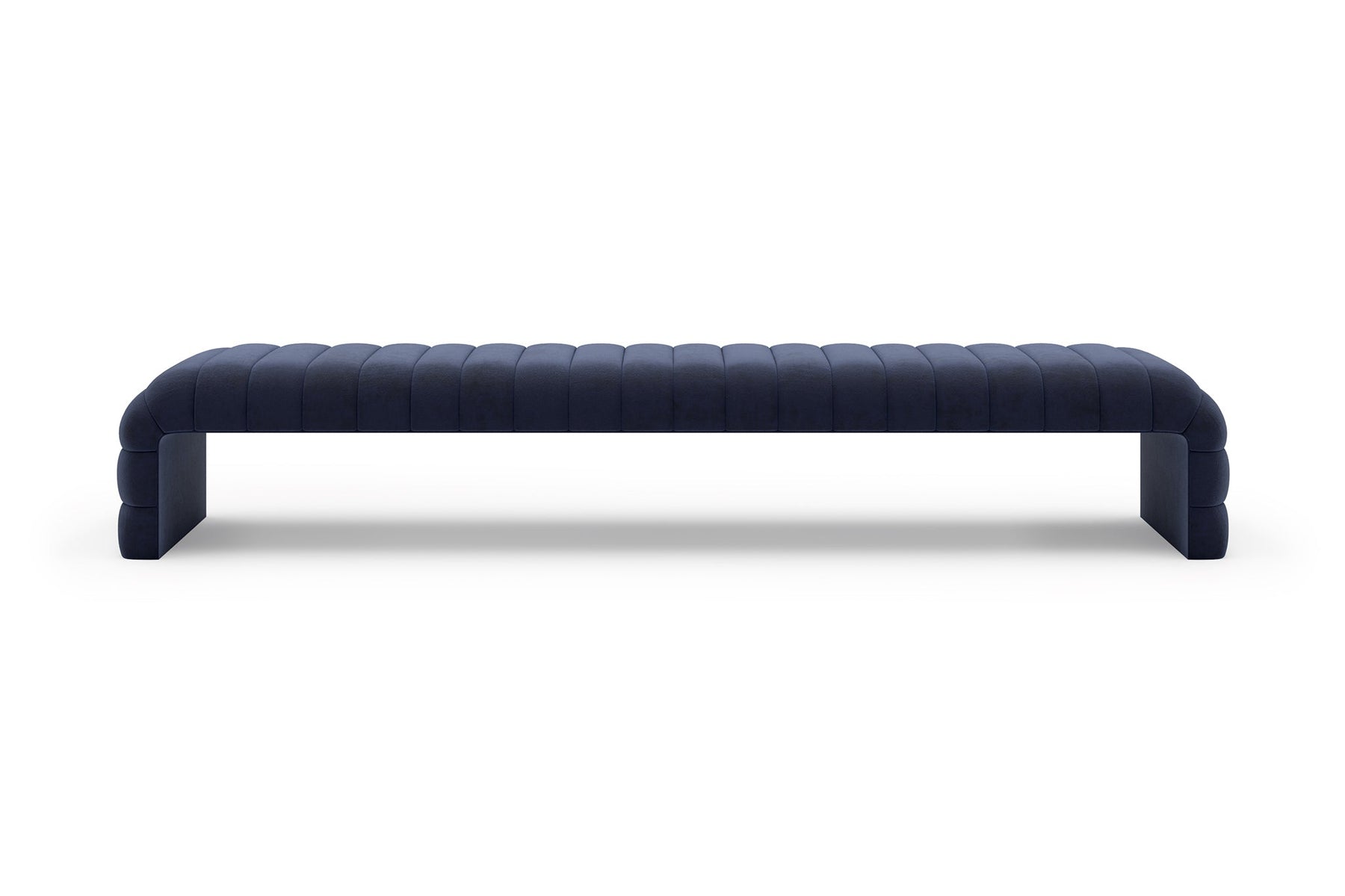 This upholstered bench is designed as a functional seating and accent piece for bedroom use. It features a rectangular silhouette with channel tufted detailing across the upholstered surface, creating a structured and uniform appearance. The bench is sized to provide ample seating space and to align visually with larger bed frames placed at the foot of the bed.