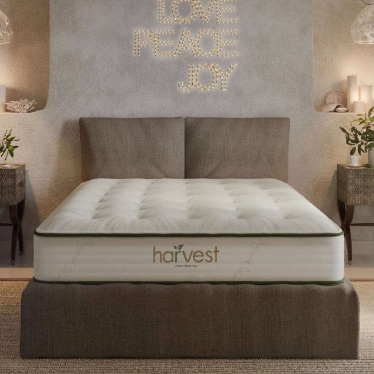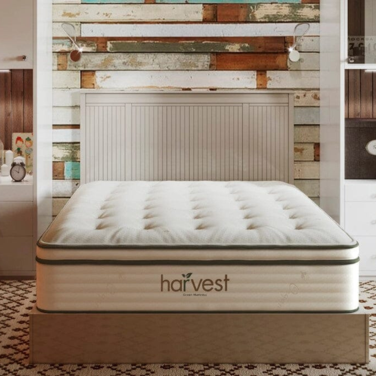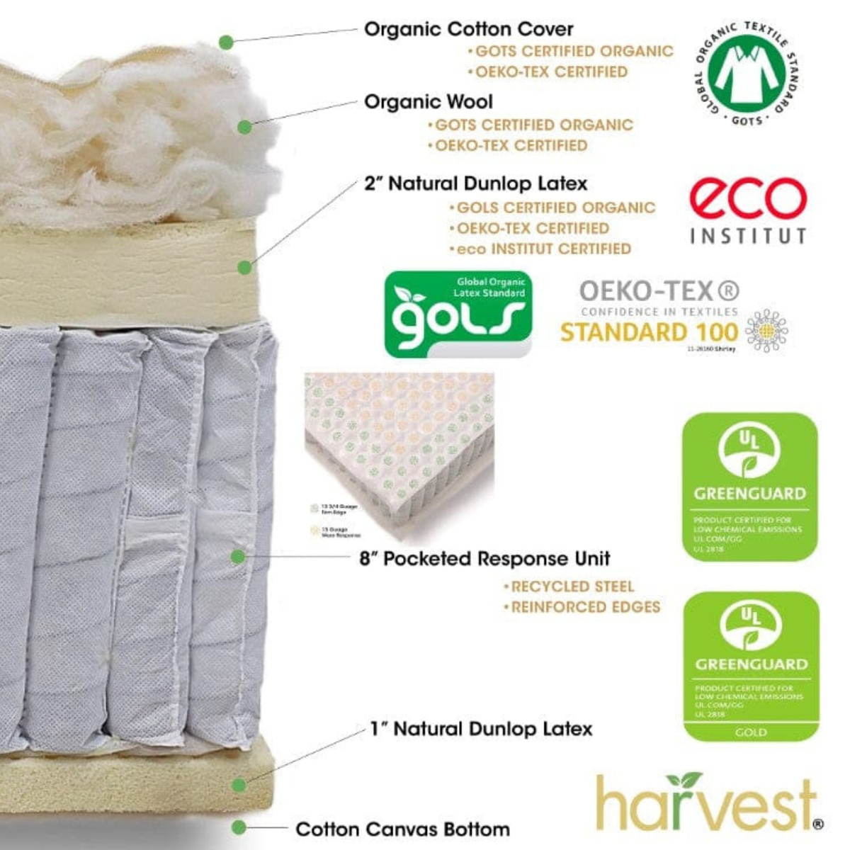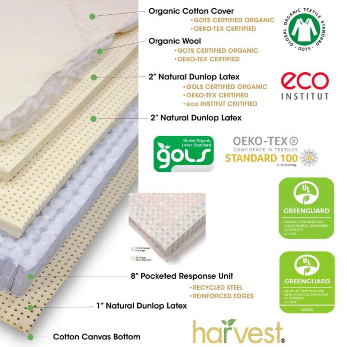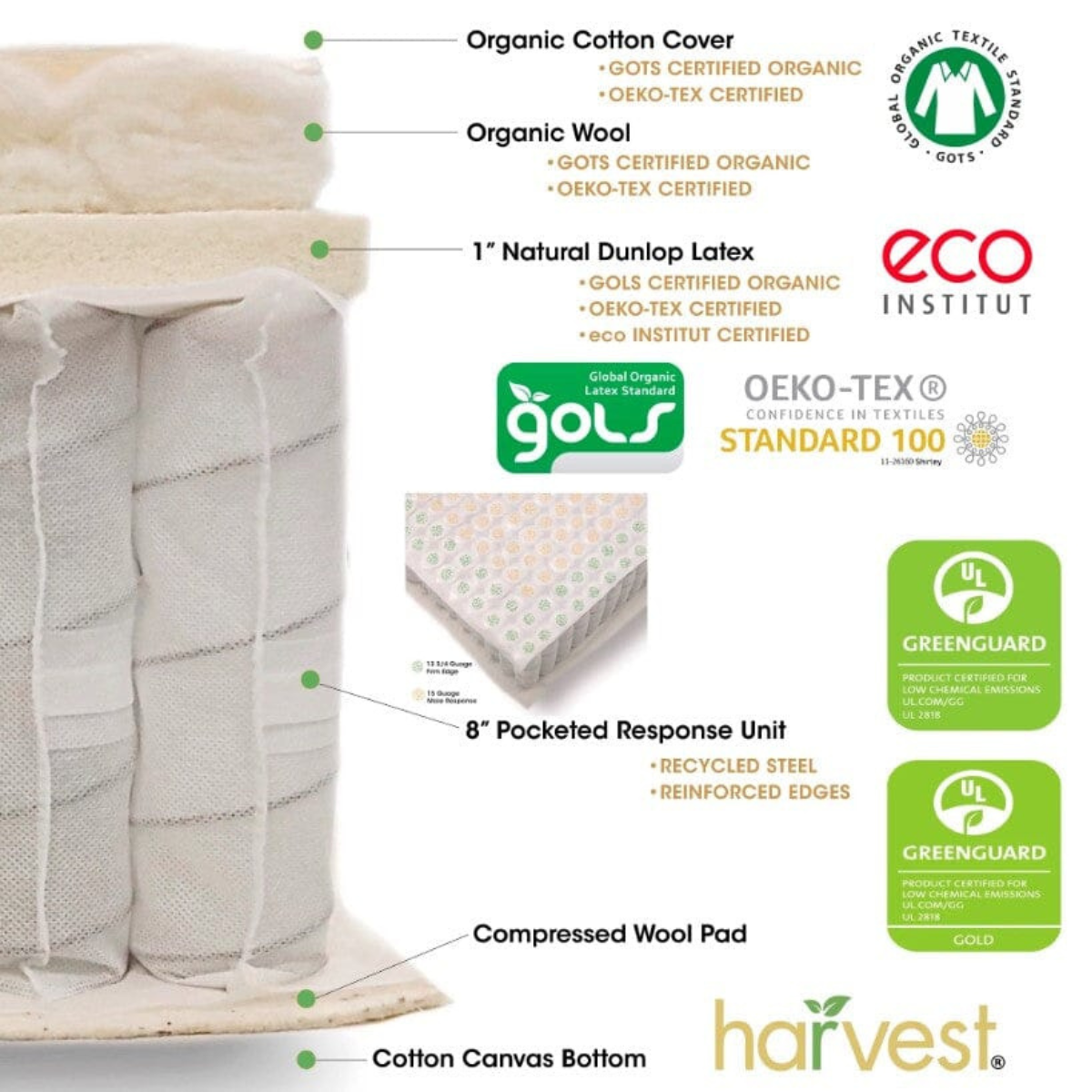 The comfort layer is made from organic Dunlop latex. The outer cover and internal padding use organic cotton and organic wool materials. These materials are selected for durability and airflow within the mattress structure. The pocketed coil system contains individually wrapped coils arranged to provide even support across the mattress surface.
